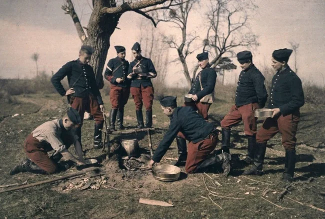 Французские солдаты готовят обед, автохром, ок. 1910