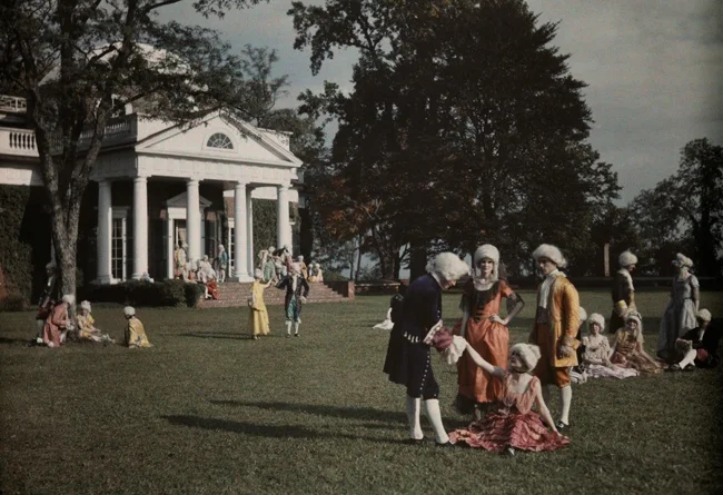 Актёры на лужайке в усадьбе Монтичелло, штат Виргиния, 1928. Автохром, фотограф Джейкоб Дж. Гейер ![]()