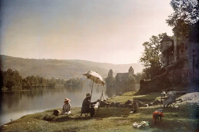 Художники на берегу реки Дордонь, Франция, 1925. Автохром, фотограф Жюль Жерве-Куртельмон