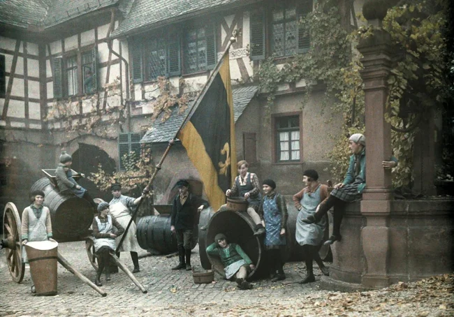 Сборщики винограда в поместье барона Лангверта фон Зиммерна, Германия, 1928. Автохром, фотограф Вильгельм Тобиен
