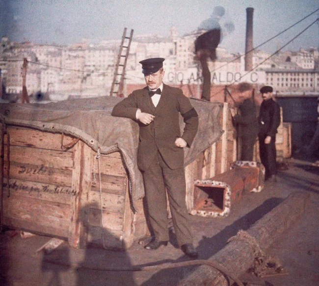 Портовые рабочие на итальянском линкоре Кайо Дуилио в Генуэзском порту. Автохром, 1910-е