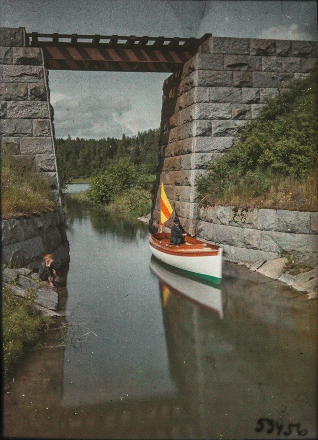 Лодка под мостом, 1910-е. Автохром, фотограф Рейно Пиетинен