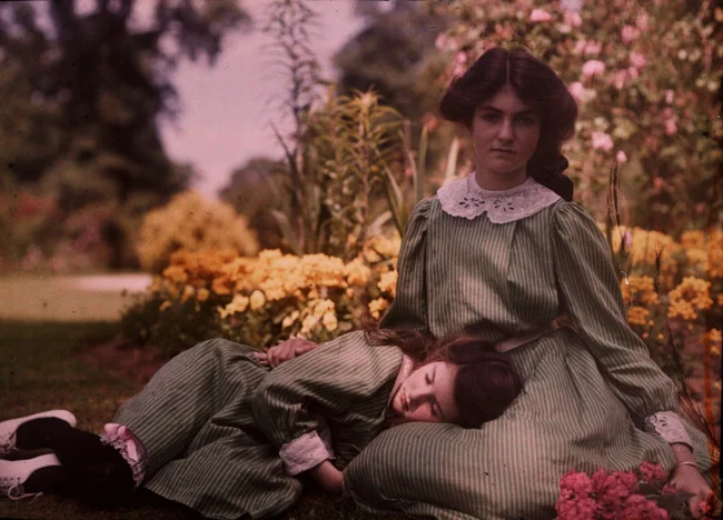 Девочки в саду, ок. 1910. Автохром, фотограф Этельреда Джанет Лэйнг