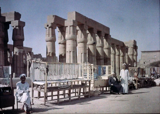Египетские торговцы возле руин храма, 1920 – 1930. Автохром, фотограф Фридрих Панет