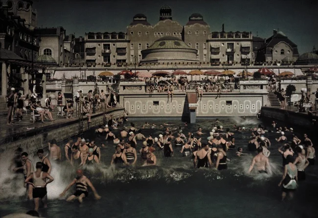 В открытом бассейне на берегу Дуная, купальни Геллерт, 1930. Автохром, фотограф Ганс Хильденбранд