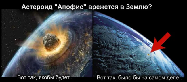 И всё же, вот ещё одна новость — к земле со скоростью 27 км в секунду мчится астероид размером с три футбольных поля. Имя ему дали ещё в 20 лет назад — Апофиз — в честь древнеегипетского бога, олицетворяющего мрак, хаос и вселенское зло. Но с лёгкой руки журналистов. раздувшим, как обычно из мухи слона, ради рейтингов и просмотров, его прозвали "убийцей Земли". Почему убийцей? Потому что 13 апреля 2029 года он может врезаться в Землю.
