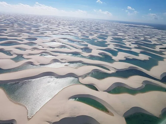 Песчаные образования и лагуны бразильского парка Ленсойc-Мараньенсес - уникальное геологическое явление, сформированное в течение тысяч лет. Ландшафты, будто бы напоминающие снежную пустыню с сугробами и льдинами, привлекают в заповедник тысячи туристов.