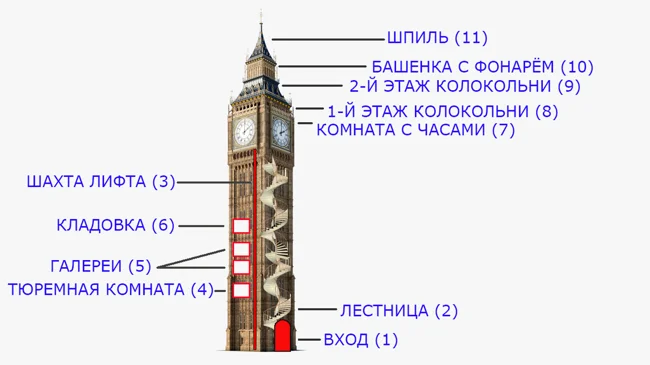 Так мы дошли до квадратной башенки (10). Это почти вершина Биг-Бена.