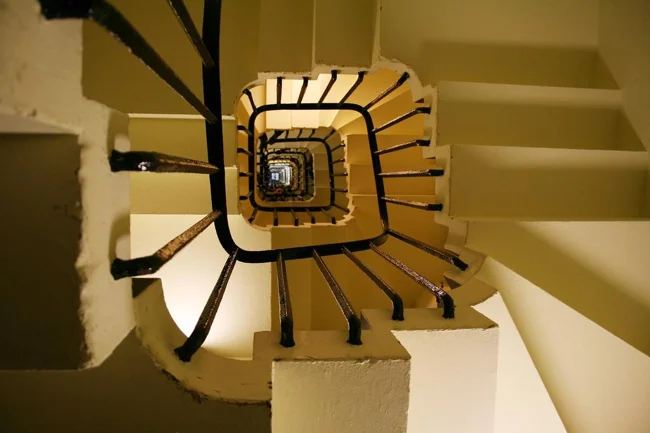Всё, что мы видим перед собой, это белые отштукатуренные стены и каменная винтовая лестница (2) с металлическими поручнями, которая уходит далеко-далеко вверх.
