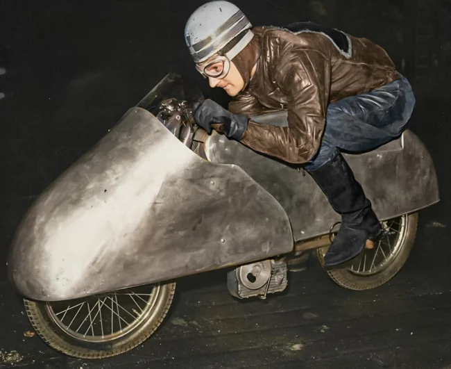 Арнольд Джонс на гоночном скутере. Англия, 1955 год. Арнольд Джонс ездит на новом скутере Britax Hurricane Scooterette, который может развивать скорость от 50 до 60 миль в час (почти 100 км/ч).