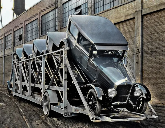 Перевозка новеньких Бьюиков на автовозе с завода-изготовителя. Мичиган, 1928 год.