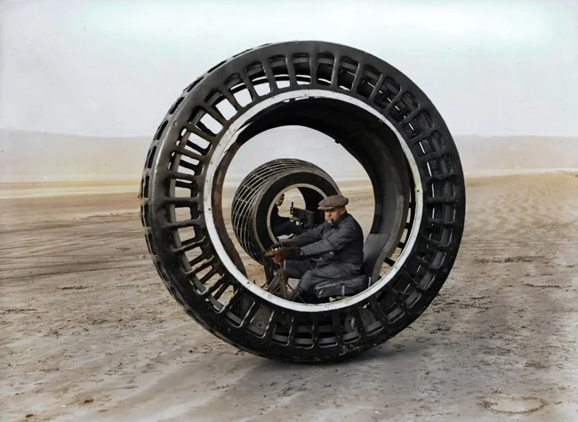 Динасфера, 1930-е годы. Необычное транспортное средство было запатентовано изобретателем из Англии — Арчибальдом Парвесом. При создании он вдохновлялся рисунками Леонардо Да Винчи. Первая собранная модель была на бензине и могла развивать скорость 50 км/ч. Двигатель и сидение располагались на одной раме и находились внутри большого колеса на колесиках. В интернете можно найти видео с испытанием этого необычного моно колеса. ![]()