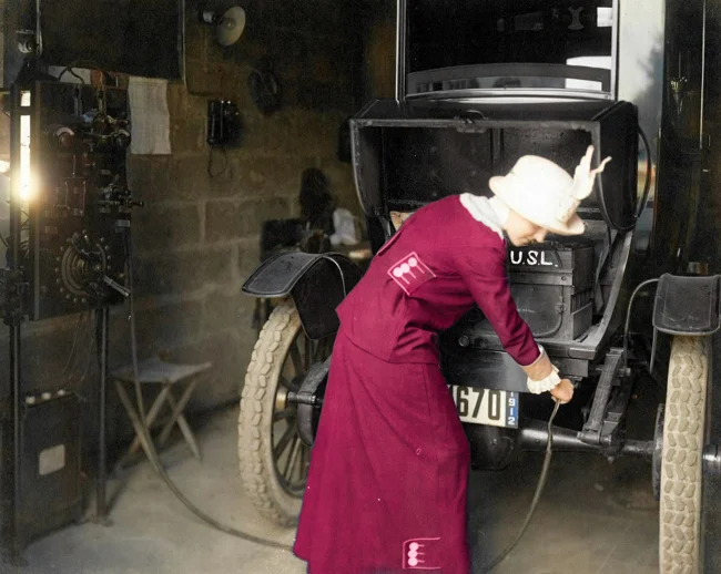 Женщина заряжает свой электромобиль в гараже. США, 1912 год.