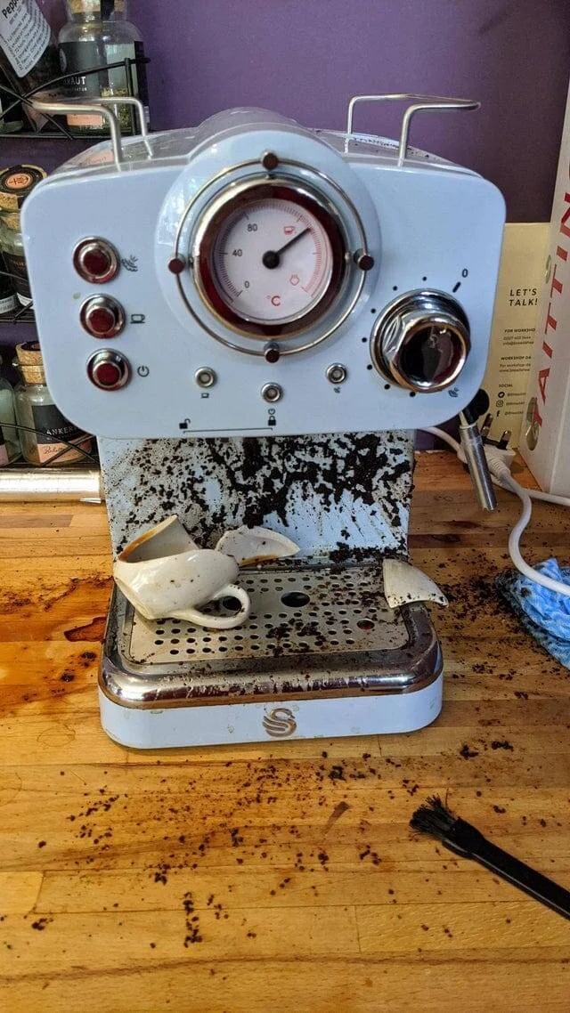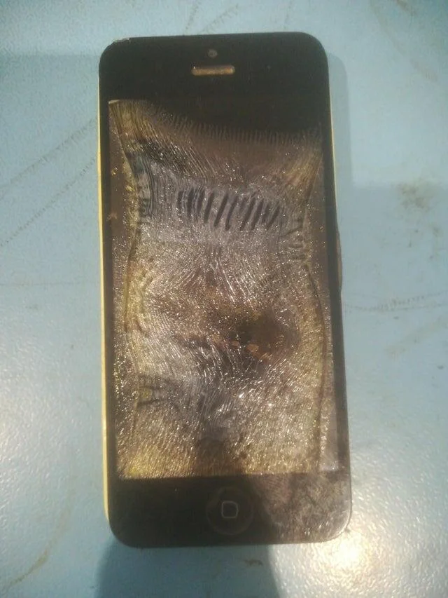 13. «Клиент сказал, что его телефон не заряжается должным образом, потому что аккумулятор холодный. Он решил, что разогреть его в тостере — хорошая идея»