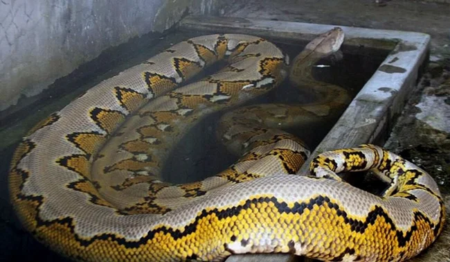 1. Сетчатый питон: самая длинная змея. Взрослый сетчатый питон — это рептилия длиной до 7,5 метров и весом под сотню кило. Он длиннее комнаты, в которой я сейчас сижу! Конечно, питон до икоты пугает всех жителей азиатских джунглей. Чудовище питается обезьянами, свиньями, оленями, молодыми малайскими медведями и... людьми?