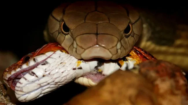 В Азии королевскую кобру обходят стороной все: упомянутые выше питоны, тигры, крокодилы, люди. Теплокровное животное размером примерно с человека погибнет всего через полчаса после укуса. Крупные холоднокровные тоже погибнут, просто страдать от действия яда будут дольше. Но больше всего королевскую кобру боятся её же сородичи. Основа рациона рептилии — все змеи, которых она может проглотить.