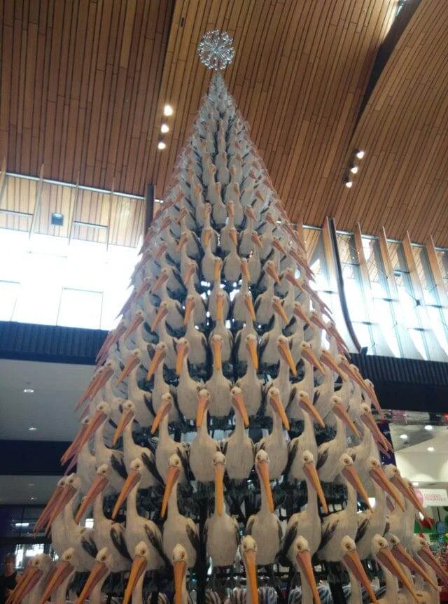 Ёлка из пластиковых пеликанов. Выглядит забавно и слегка пугающе
