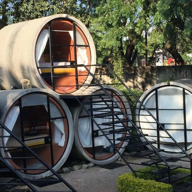 В Мексике расположен отель под открытым небом с рядом номеров, выполненных из бетонных труб. Выглядит очень необычно и достаточно комфортно.