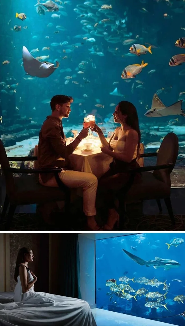 Отель Атлантис в Дубае - это большой гостиничный комплекс с подводными номерами и ресторанами с видами на лагуну коралловых рифов.