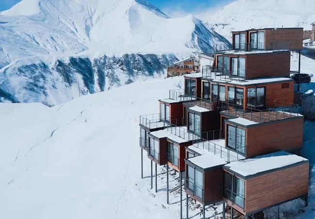 Отель Квадрум расположен на Кавказском хребте, Грузия. Он расположен на высоте 2200 метров и полностью изготовлен из корабельных контейнеров.