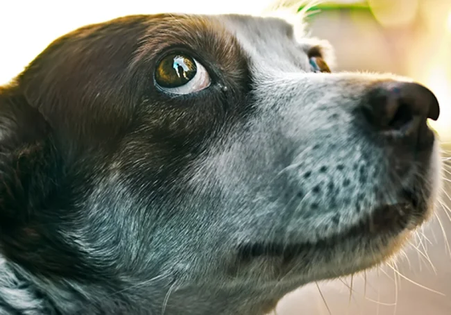Чтобы понять это, обратите внимание на тело питомца. Собака при такой «улыбке» всегда держит вас в поле зрения. Даже отворачивая голову, она не отрывает от вас взгляда: получается «китовий глаз» — когда видно не только радужку, но и белки глаз. Она тяжело дышит, часто облизывается и зевает.