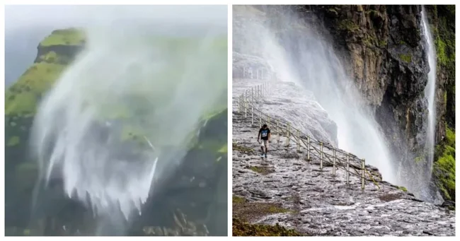 Обратный поток формируется, когда сильные муссонные ветры выталкивают большой объём воды вверх. Образовавшиеся брызги обладают достаточной плотностью, чтобы сформировать своего рода небольшой водопад. А мощный направленный вверх поток создаёт эффект несущейся к небу воды.