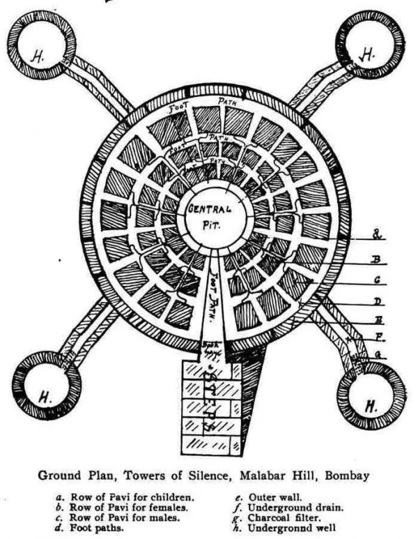 Приподнятая круглая конструкция башни, которую местные жители называют Дунгервади, состоит из трёх рядов: внешний ряд предназначен для мужчин, центральный - для женщин, а внутренний - для детей. На территории также находятся небольшие сооружения, называемые бунгли, где читаются молитвы перед тем, как тело переносится в дахму специальными смотрителями кхандиями.