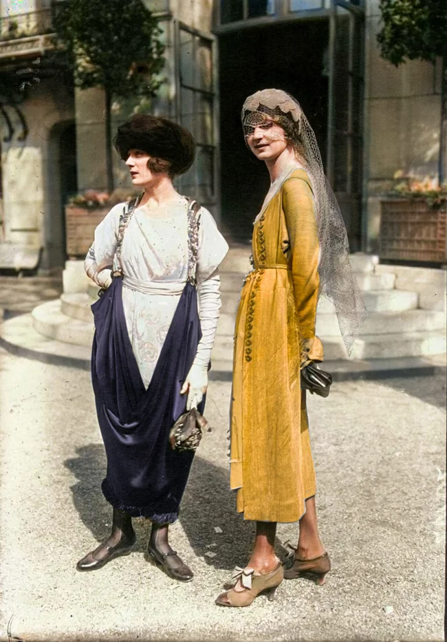 Франция, как метрополия северной Африки видимо брала оттуда и часть культуры, на девушке слева зуавы - предмет из национальной одежды алжирцев. Да и головные уборы заставляют удивиться.