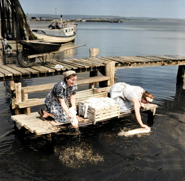 Прачки Эбба Стендаль и Лиза Йоханссон. Швеция, 1958 год.