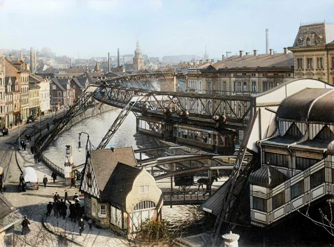 Подвесной монорельс, расположенный над рекой Вуппер в немецком городе Вупперталь, 1913 год.