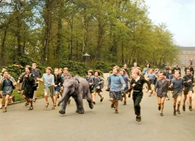 Слонёнок резвится с детьми. ГДР, 1958 год.