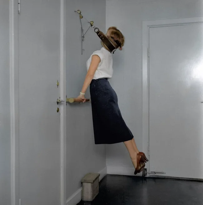 Директор по гимнастике демонстрирует гимнастическое оборудование на металлургическом заводе, Швеция, 1957 год.