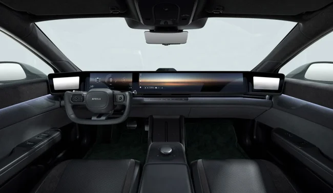 Электромобиль Afeela 1 довольно крупный: длина — 4915 мм, ширина — 1900 мм, высота — 1460 мм. Колесная база — 3000, а заявленный дорожный просвет — 137 мм. Салон рассчитан на пятерых седоков, объем багажника — 765 литров по американской методике EPA. Интересно, что машина имеет традиционные зеркала заднего вида, хотя они дополнены боковыми камерами и соответствующими экранами в салоне. Заявлено, что в производстве будет широко использовано вторсырье: не только для отделки салона, но также для кузова и деталей подвески.