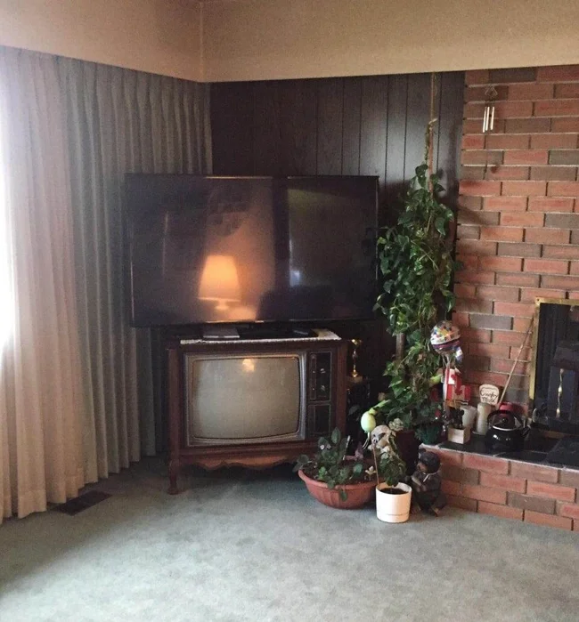 Моя тётя использует любимый старый телевизор в качестве подставки для современного