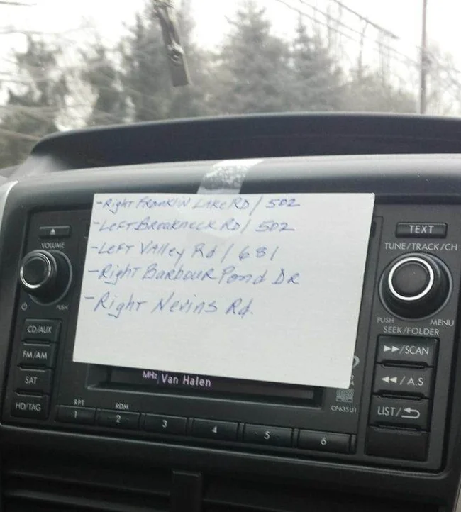 Папа не доверяет навигатору и вешает схемы проезда прямо на экран