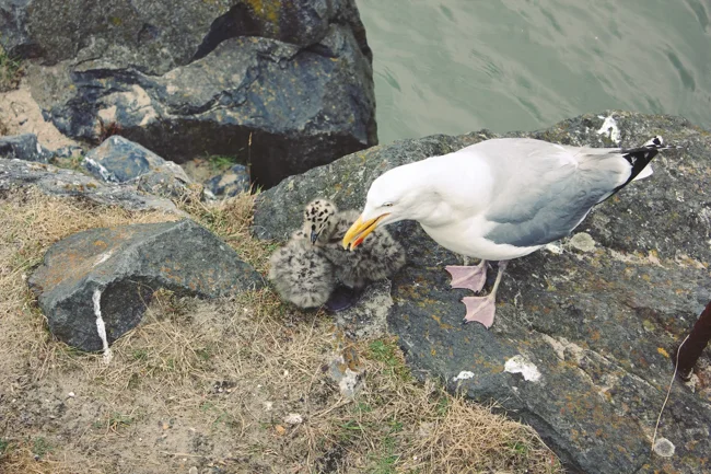 Как ни странно, в деле выращивания детей царит удивительная гармония. Серебристые чайки с радостью пускают свою изобретательность в созидательное русло, поэтому их гнёзда очень различаются по размеру и материалам: ветки, трава, мех животных и даже водоросли — всё идёт в ход.