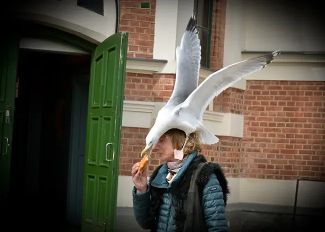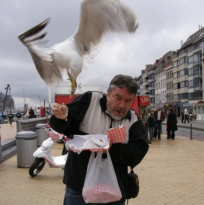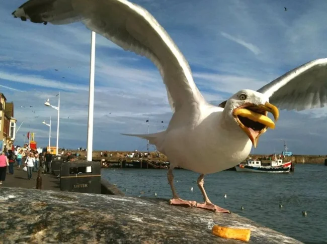 Думаете, господство среди птиц утолит жажду ультранасилия? Как бы не так, на орехи достаётся и людям! Чайки воруют пищу со столов в летних кафе, таскают её из магазинов и даже из рук прохожих! По опросам жителей Великобритании за 2021-2022 года, 48% хоть раз подвергались нападению шибанутой птицы. Причем в половине случаев защитить свой обед у людей не удавалось.