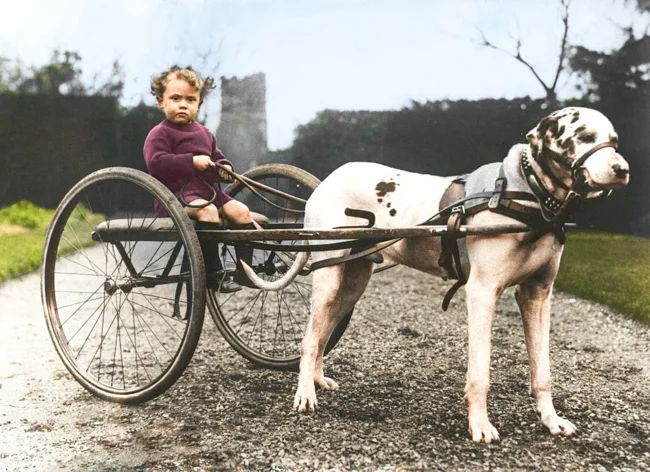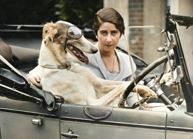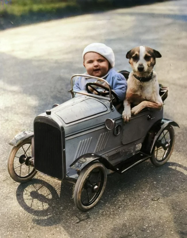 Ребенок в игрушечной машине с собакой-водителем, 1935 год.