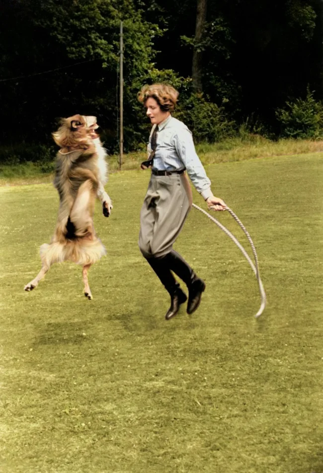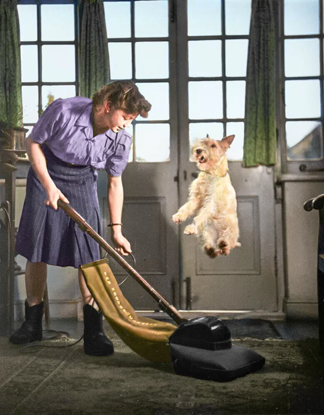 Жесткошёрстный фокстерьер Аста подпрыгивает, спасаясь от пылесоса, 1949 год.