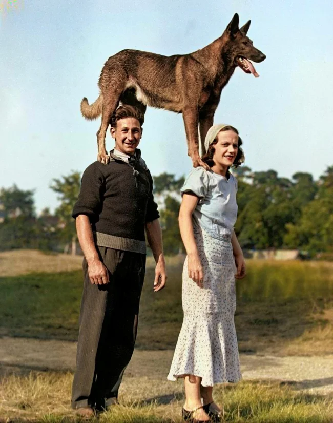 Пара с собакой на плечах. Великобритания, 1910-е годы.
