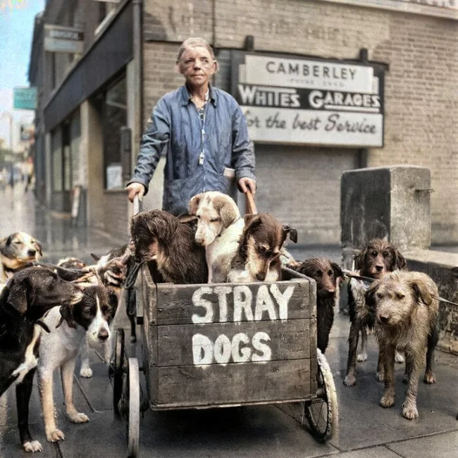 Кэмберли Кейт и ее бродячие собаки в Англии, 1962 год. Кэтрин Уорд, ласково известная как Кэмберли Кейт, была британской любительницей собак и эксцентричной женщиной.