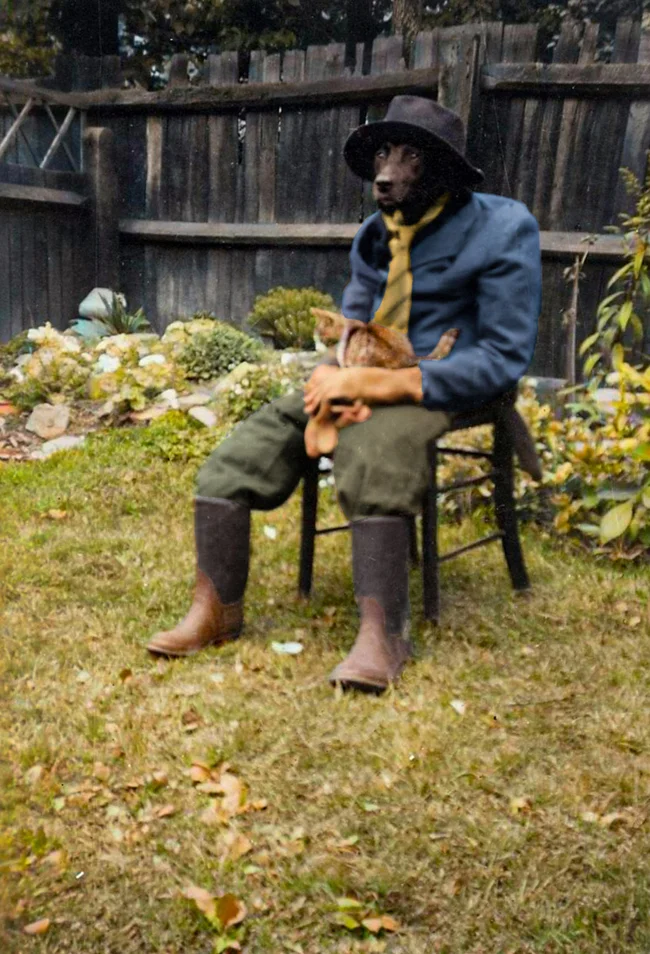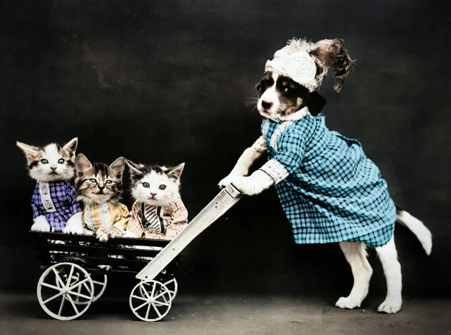 Собака, переодетая в человека, с кошкой «на коленях», 1950-е.