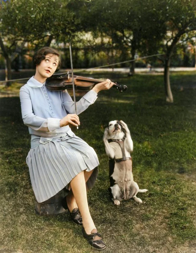 Американская актриса Салли О'Нил играет на скрипке, а американский бульдог сидит на задних лапах рядом с ней. Это кадр из немого фильма режиссера Джона П. Маккарти «Бекки».