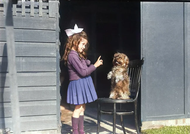 Девочка обучает свою собаку команде «сидеть», 1930-е годы.
