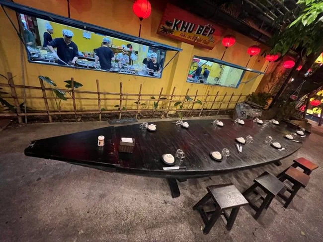 В ресторане морепродуктов во Вьетнаме стоят столы в форме лодок