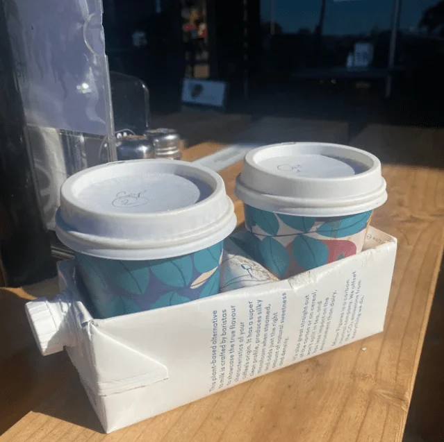 Тут используют пачки из-под молока в качестве подносов для кофе