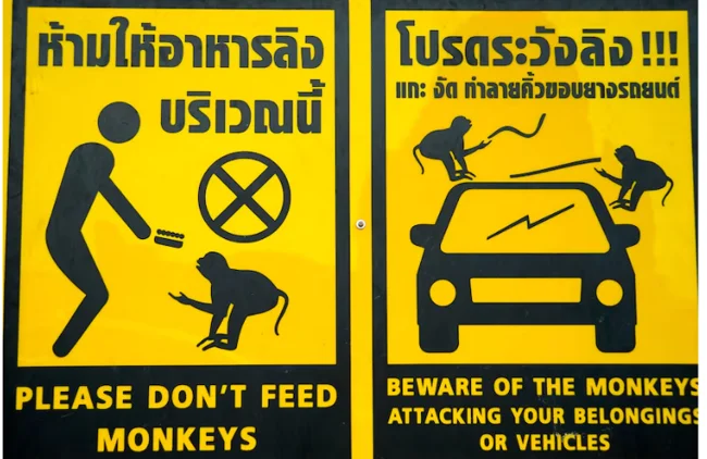 Везде по городу напоминалки для туристов о правилах поведения с обезьянами