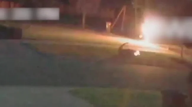 Во вторник полиция Виктории опубликовала видеозапись в надежде разыскать злоумышленников. Офицеры утверждают, что мужчины ворвались в дом и украли личные вещи, а затем подожгли автомобиль. Жильцы в тот момент отсутствовали.
