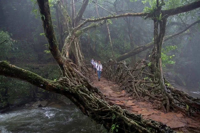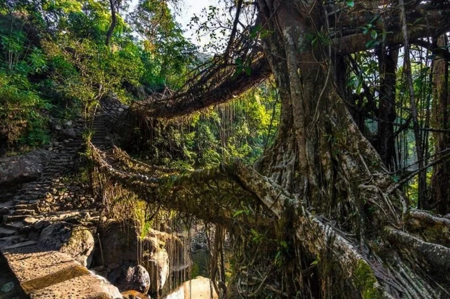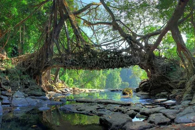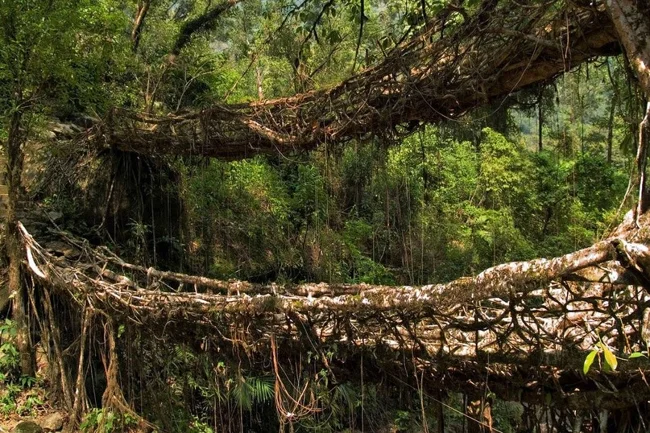Есть на северо-востоке Индии небольшой штат Мегхалая. Там на плато Шилонг проживает два народа – кхаси и джайнтия, которые умеют делать живые мосты, которые являют собой удивительные примеры биоархитектуры.