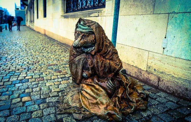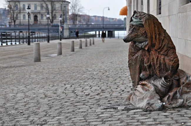 У подножия стокгольмского моста притаилась маленькая грустная фигурка, едва заметная под грудой смятых одеял, безмолвно взывающая к вашему сочувствию. Эта статуя под названием Hemlös räv («Тряпка и кость») выглядит ещё печальнее из-за остренькой лисьей мордочки.